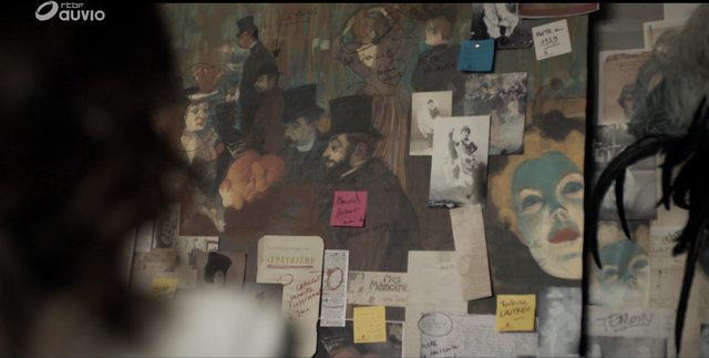 總之這舞者 Estelle陷入身份失憶甚至還有其他非現實記憶 (!)顯有很大的心理問題亟須專業協助!而死者身邊放著一張高調的羅德列克《在紅磨坊》畫作時,這場謀殺不論是不是她幹的恐怕都有高調的藝術動機、或至少是煞有其事以藝術故佈疑陣中... 於是跟著男警主角 Antoine趕到現場的藝術史家主角 Florence 當然先開啟「藝術通靈」模式:侏儒大師羅德列克呀,你那年代真有這場兇殺案?你畫作內有哪些角色可勾勒當年現場?在你的「19世紀紅磨坊」人們揮灑的是什麼情懷?這裡上流男人對底層女性是傾慕抑或剝削?那我們這間「21世紀紅磨坊」您老又會怎麼看?
