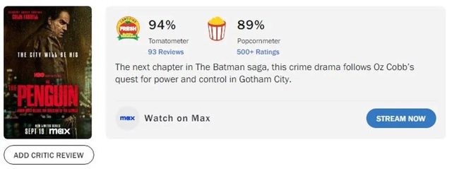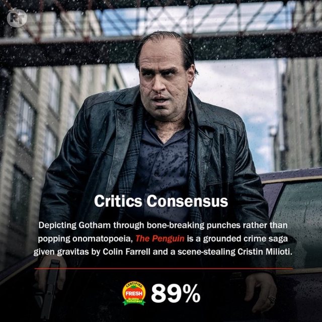 》(The Penguin)首集上週正式上架,在爛番茄上獲得 94% 新鮮的極高媒體評價,不僅