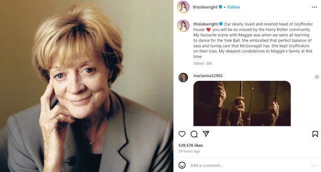 「你將會被《哈利波特》世界的朋友們永遠懷念。我最喜歡與瑪姬合作的一個場景,是我
