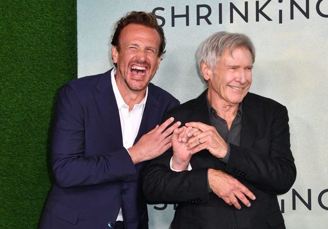 傑森席格(左)、哈里遜福特在「誠實診療室」第2季首映會牽手搞笑。(法新社)
