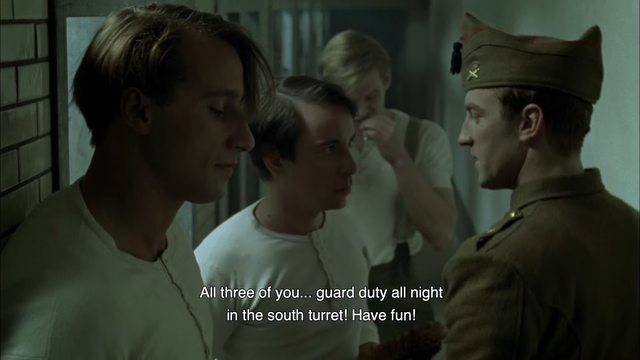 首先兩男中與 Helena 心心相印的 Alfred 別的沒有就是一個「真」,不論承平或戰時他要的不多就是簡單的愛情與理想,為了能見女友一面傳遞一點花草氣味 (!)他能身為戰俘甘冒大險偷翻鐵網只為摘一株小花!至於平日不論是比利時軍中的形式主義、還是德軍戰俘營中的臉色眉角,諸般虛偽矯飾他全嗤之以鼻、只願忍辱負重做完任務努力活下去;相對地好友 George 就笑臉迎人長袖善舞,說好聽是與人為善人見人愛、但也很容易輕諾寡信隨波逐流,這種身段不論在比軍中服務法語區長官、還是在戰俘營合作德國長官,他總能快速上爬走路有風 (!)卻都自命是服務弟兄。