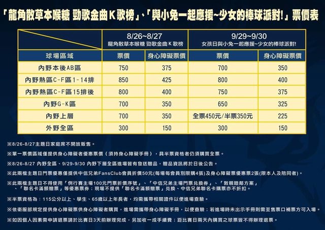 中信兄弟今日(30日)公佈下半季主場售票資訊,下半季主場賽事將於7/14開戰!主題日