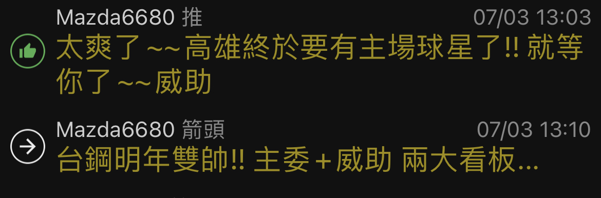 → Mazda6680: 我開頭就說了恭喜台鋼啊為何不行!? 威助也年底後絕對會 07/03 17:01