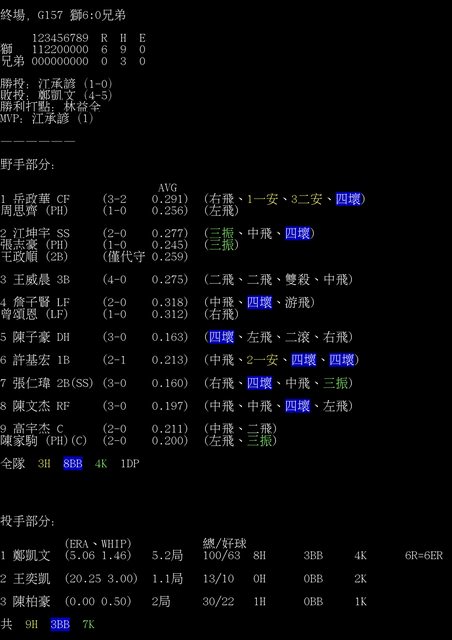 標題[情報] G157 獅6:0兄弟 全場數據box