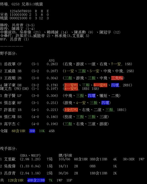 標題[情報] G253 兄弟5:3桃猿 全場數據box