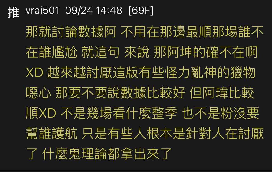 推 vrai501: 那就討論數據阿 不用在那邊最順那場誰不在誰尷尬 就這句 09/24 14:48