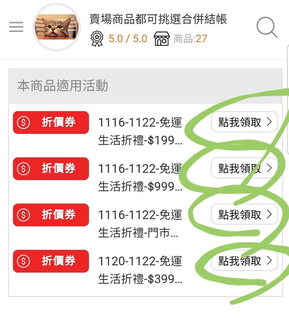使用7-11 OP會員結帳前領取全站折價券(綠框處) (折價券使用期限11/16至11/22)