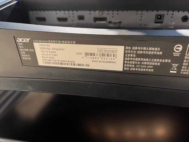 ◎硬體型號:Acer XZ321QU 32寸 2k 144hz ◎欲售價格:4500 ◎品樣狀況: 1.購買日期 :2018/9/16 2.保固有無 :過保 3.使用狀況 :正常使用換下,螢幕上有一條刮痕已經反應在價格上 4.配件完整性:無原盒其他都有 ◎佐證資料: 1.實物照片