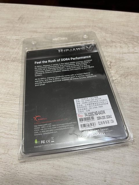 ◎硬體型號: 芝奇 Ripjaws V DDR4-3200 32GB*2 黑色 桌上型記憶體 F4-3200C16D-64GVK
