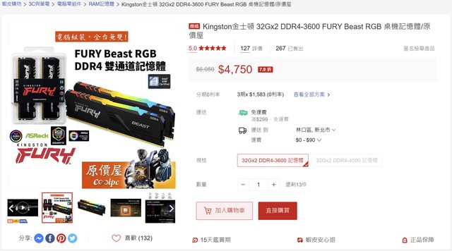2. 【暫售】Kingston 32Gx2 DDR4-3600 FURY Beast RGB