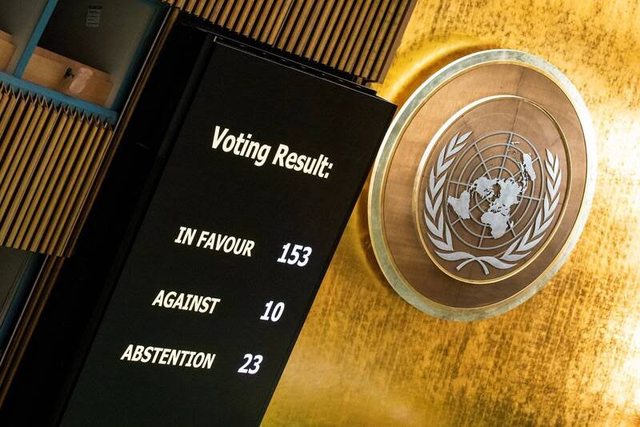 據路透報導,由193個成員國組成的聯合國大會12日通過1項決議草案,呼籲加薩衝突雙方立即停火,共153個國家投下了贊成票,另有23國棄權。美國和以色列堅稱停火將創造對哈瑪斯(Hamas)有利局面,與其他8個國家一同反對該決議。