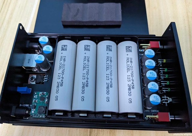 內部分三大塊,左輸入,中21700電池*4,右LED跟charger的電容陣列
