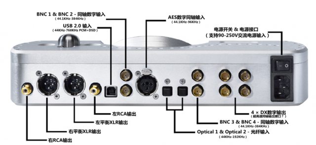 然後有一個USB與一對BNC輸入,BNC通常用於數位輸入與升頻,然後有AES輸入,光纖輸入,之