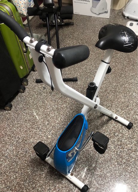 2.SANsport健身車:電子面板已拆掉,坐墊有裂縫用膠帶貼住,功能正常。