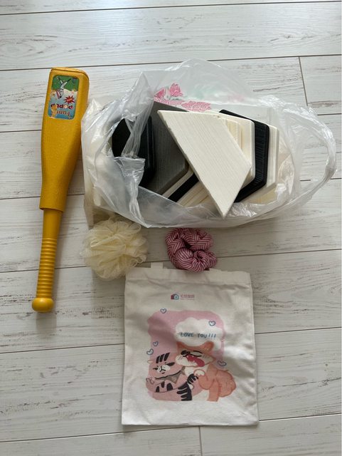 六角防撞泡棉、伸縮兒童球棒、髮圈、沐浴球、棉布袋