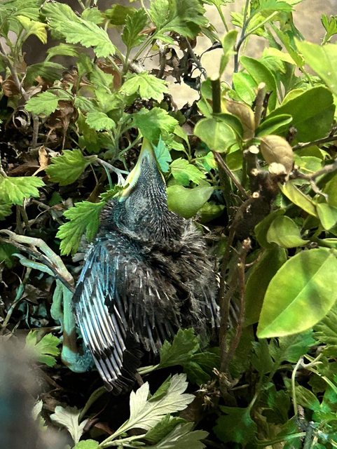 經國路三段的全國電子門外盆栽裡,發現一隻疑似掉落的亞成鳥,黃嘴黃腳,有點大隻,但