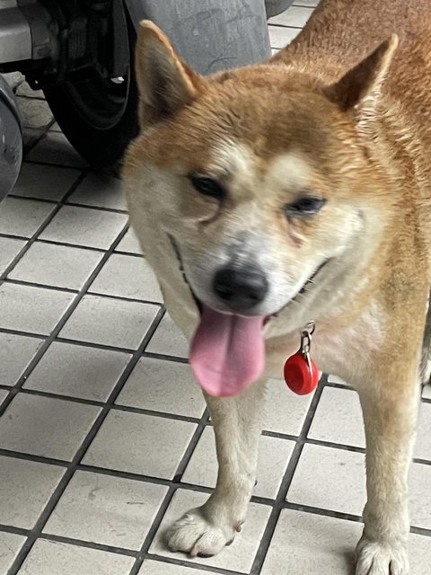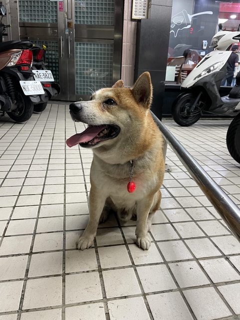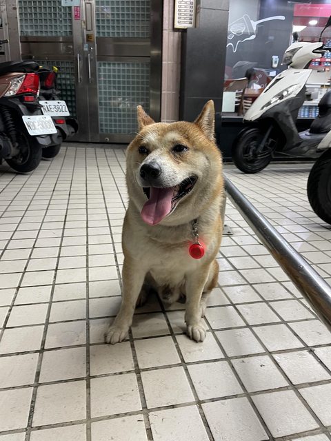 他很乖會聽話坐下,脖子有一個會發紅光的項圈,臉有點髒