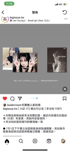 標題[閒聊] 當期李泳知/泰勒絲 大誌雜誌代買