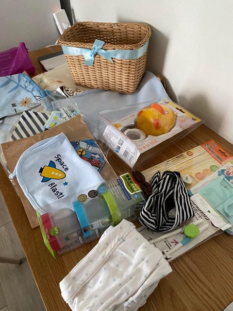 藤編籃、包巾、圍兜、三歲以上童褲、領結、學習筷、小獅王吸管組、音樂鈴、麗嬰房媽媽