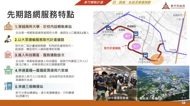 所以第32頁即強調串連三個巴士轉運站、全台第一條輕軌路線進入科技園區