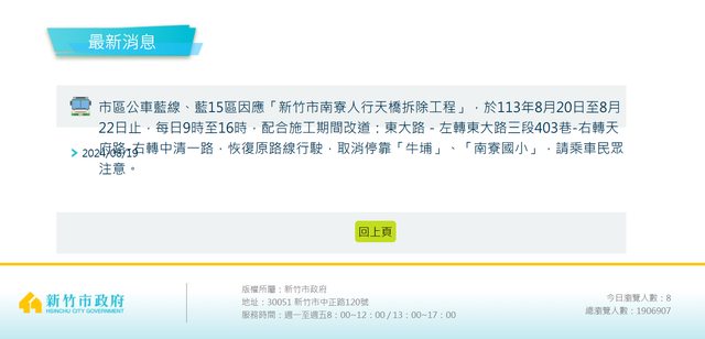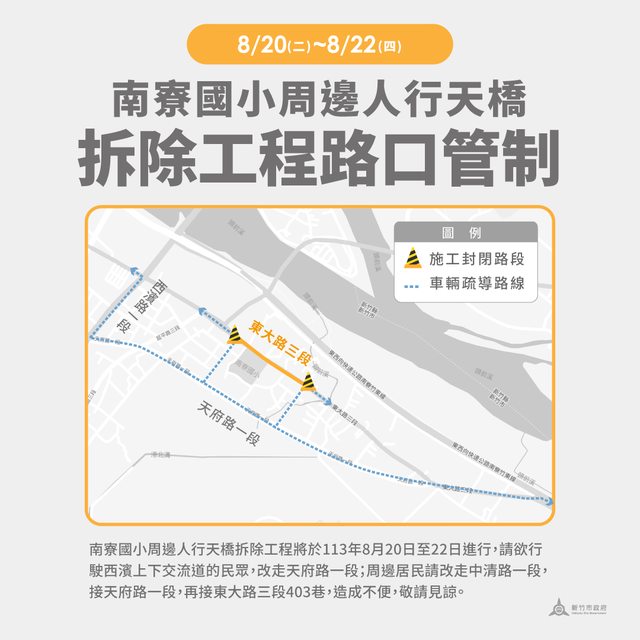 「新竹市南寮人行天橋拆除工程」,於113年8月20日至8月22日止,每日9時至16時,
