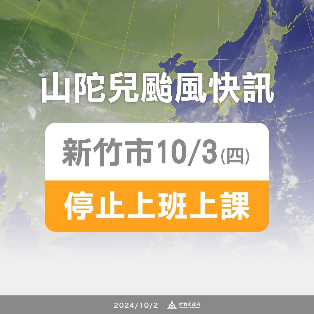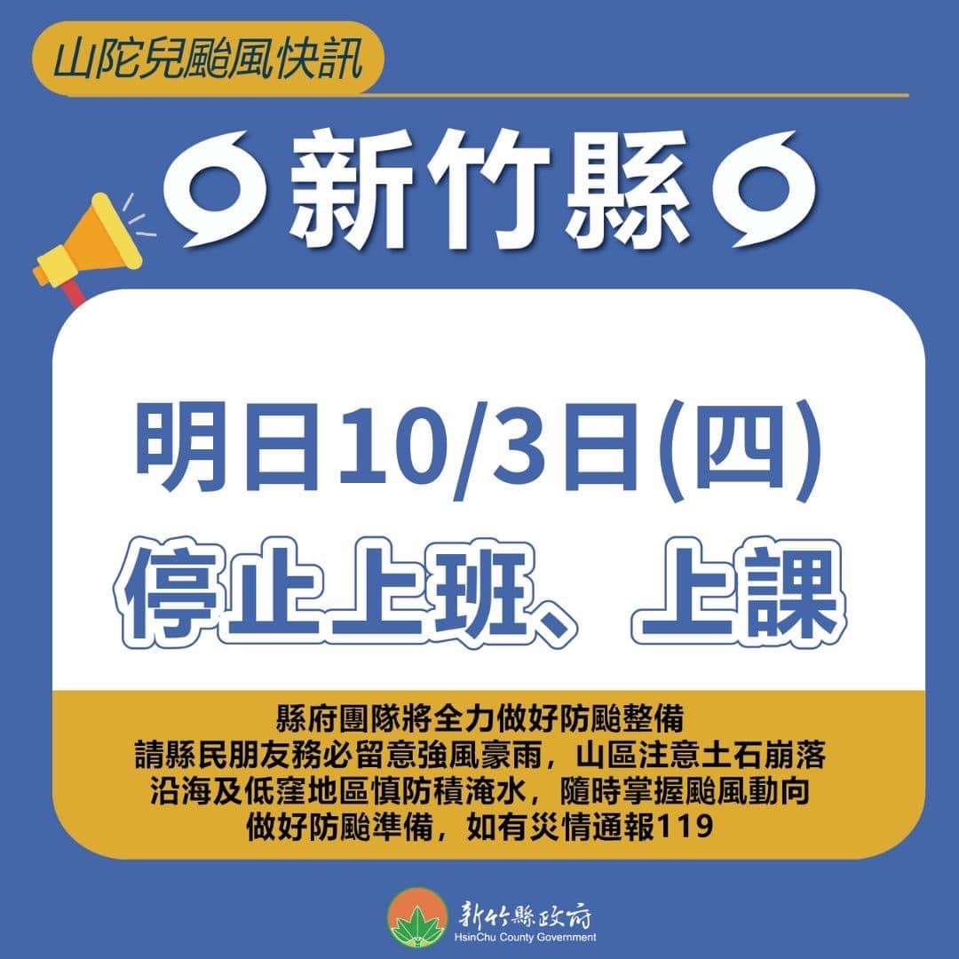 → tgordoncheng: 新竹縣明天停止上班、停止上課。19:55:11更新 10/02 20:00