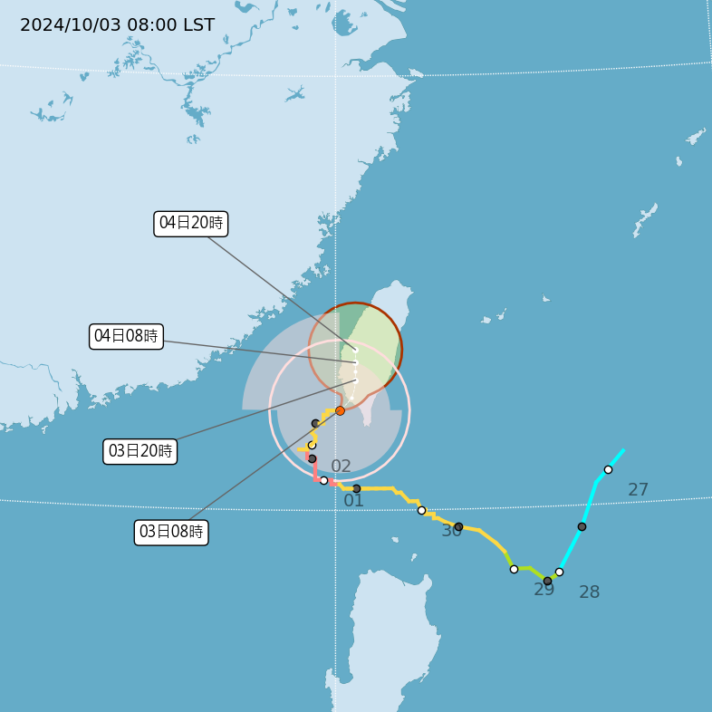 → trieau : 中午登陸後有機會降為低氣壓,就不會有預報,縣市 10/03 13:27