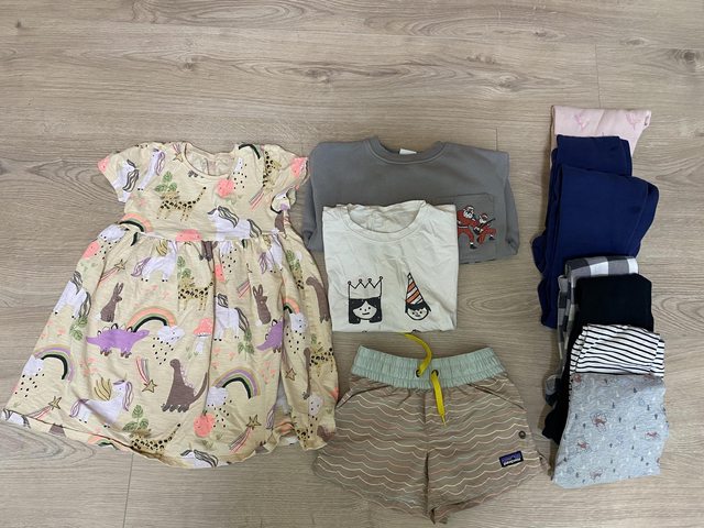 女童(大約6-7歲適穿)衣物一批,項目如照片。其中短褲和洋裝只穿過幾次,但leggings、