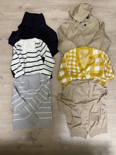 女性成人衣服數件,項目如照片。右側的cardigan和風衣僅在家中試穿、沒有穿出門。左側