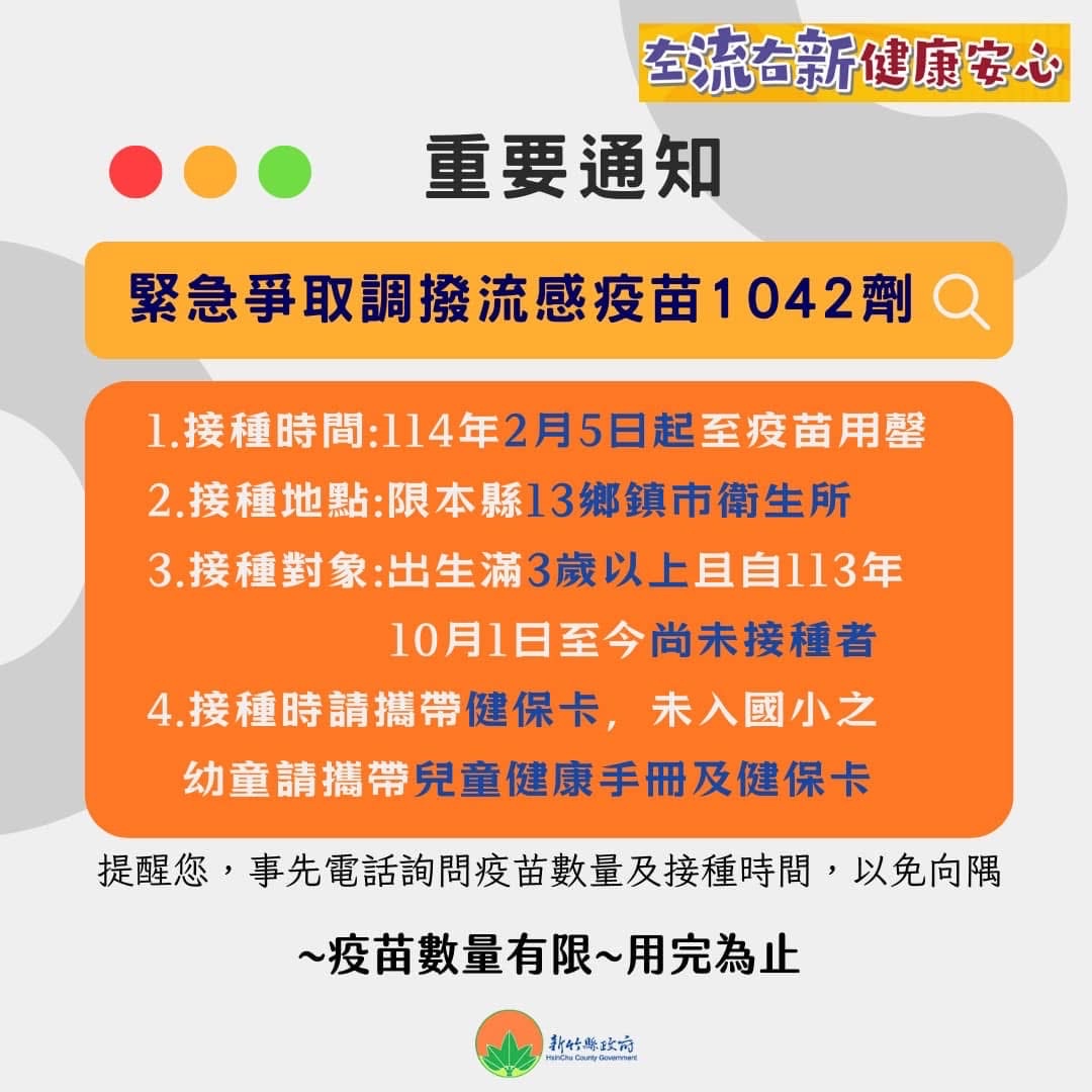 推 khhuang1 : 剛看到消息,新竹市三區的衛生所明天起有公費流感 02/04 18:51