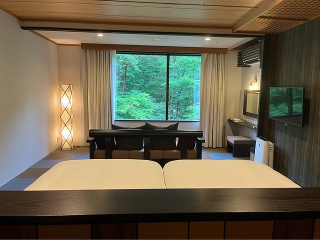 下午入住星野奧入瀨溪流飯店,房間是在東館洋式房,面溪流、看一片翠綠。