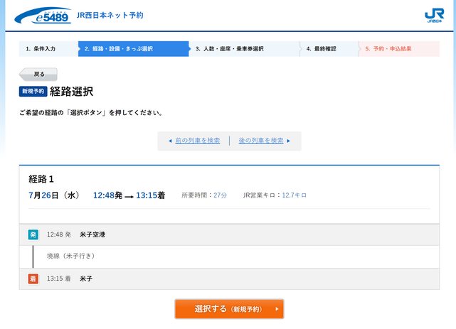 以米子空港到米子為例,利用列車直接用預設值全選