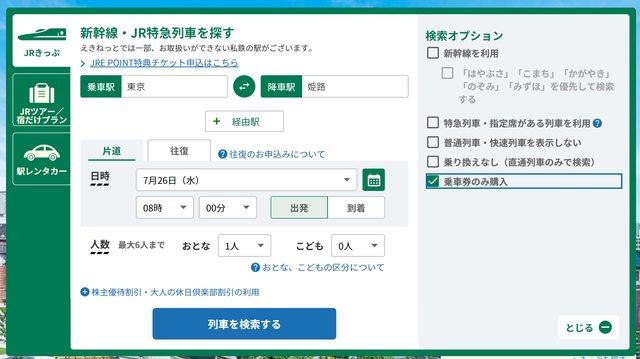 ,並勾選"乗車券のみ購入"(單買乗車券)後,再按"列車を檢索する"