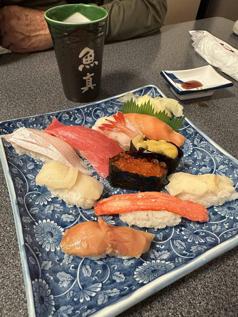 飯店Check in後小憩一下,步行至「魚真」用餐。點了特上握壽司、蟹肉丼飯、烤烏賊