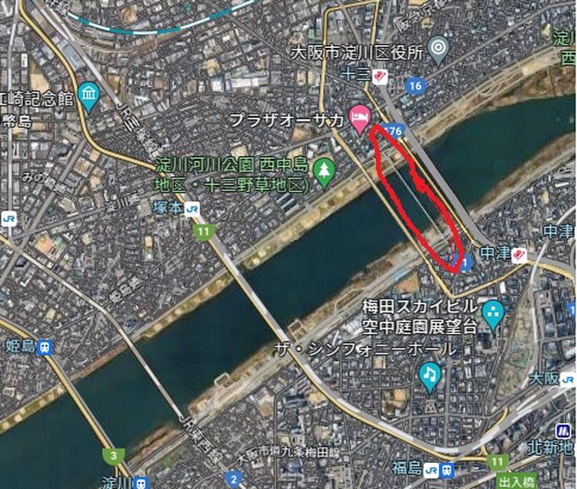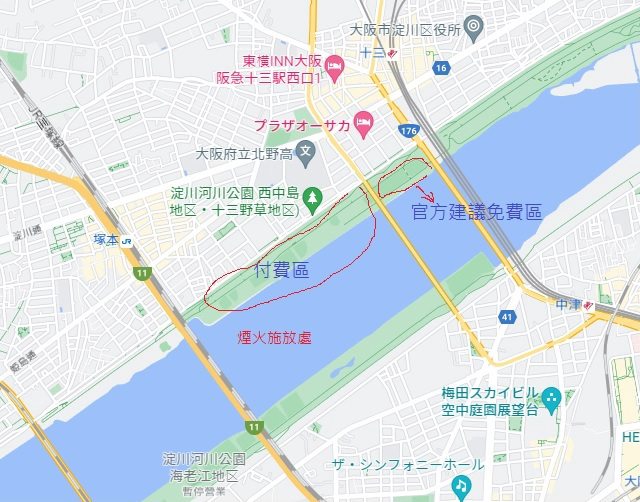 煙火施放地點大約在新十三大橋的西側 售票區域就在河堤正面對煙火 另外一次梅田側的河堤 往年聽說也有售票 但今年好像因為整修的關係所以沒有開放售票 售票區域的東北側是官方建議的免錢觀賞區 阿伯我就是去這區 but!!!!!!!!!!!!!!!!! 實際上那區還多了一座橋 https://i.imgur.com/88PMTpc.jpg