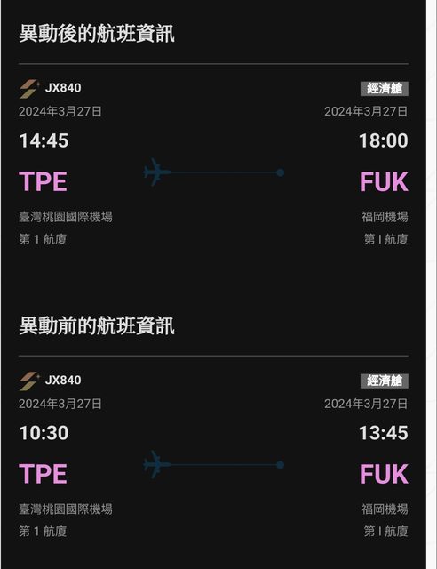 推 lin88025 : 今年櫻花季搭星宇去福岡 當時航班時間也異動 08/09 18:11