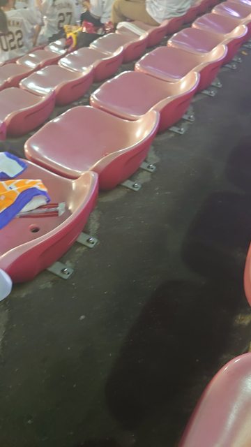 然後甲子園球場座位沒靠背,更差的一點是座位是平的,所以前面的人屁股往後靠是會卡