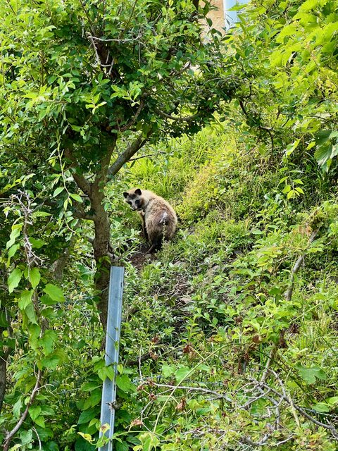 狸貓平時都安恬地在公路上覓食,但他們相當怕人,遠遠地就會躲進樹叢。我得把車停得