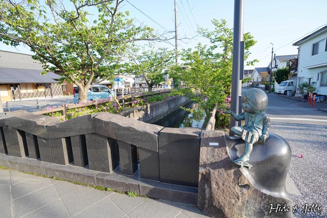 水木茂街道中段有一條河道,而鬼太郎本人正捧著眼球老爹倚靠在橋上休息,河岸兩旁都