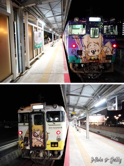 時,意外發現停靠著一列兩輛的列車,都是彩繪列車呢!上圖是こなきじじい(子泣爺爺)