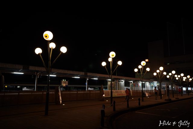 回到米子駅,白天時沒有時間照的月台,月台上還有拿著日本軍旗的鬼太郎,以及飛在半