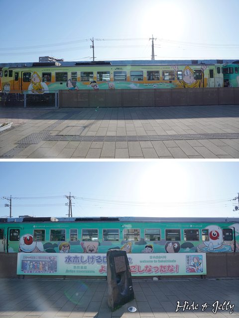 雖然剛剛沒有坐到彩繪列車,但就在我們拍照時,車站緩緩駛入兩列彩繪列車,分別是「