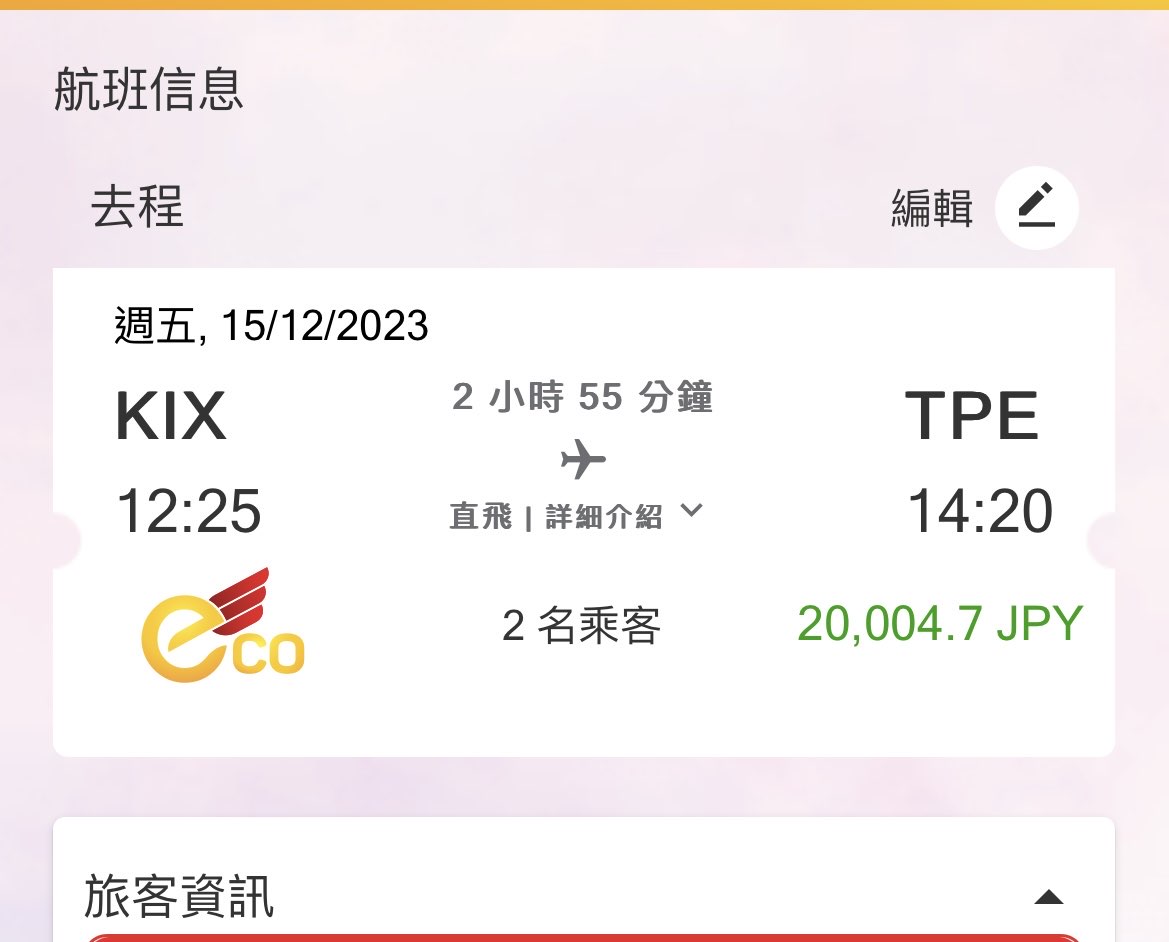 推 ttnsangx73 : 已買12月份 雙人單程含一人行李 08/26 20:04