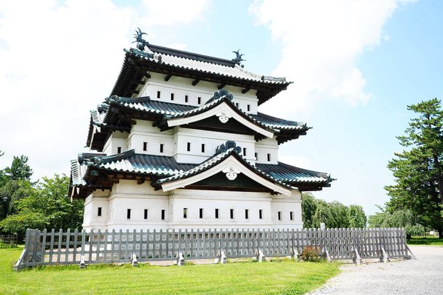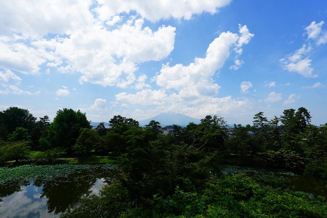 12. 弘前植物園。這個地方還是要春天或花季來比較適合,場地頗大但夏天進去就是看到 綠油油景象而已,而且比藤田庭園更沒有遮蔽物更曬 13. 弘前城。是著名的賞櫻地點,護城河兩側種滿櫻花樹,到達天守前的地方也有兩株 300年樹齡的巨大櫻花古木,夏天只有綠葉的櫻花樹,目前的弘前城因為石垣崩落要修復 所以移動75公尺到現在這位置,所以看到的弘前城跟海報不一樣。天守裡面展示移動的過 程,城前能遠眺看到號稱「津輕富士」的岩木山