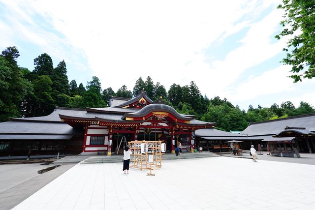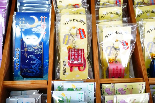 3.盛岡八幡宮。腹地廣闊,供奉多達12座神社,神社前有設立供民眾自拍的腳架;在木箱 裡有許多鯛魚形狀的預言籤詩,可使用釣竿釣起;御守設計也十分多樣化,單一主題就有 好幾種不同的外觀,但也比其他神社的價格高上一些,