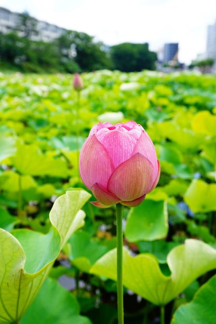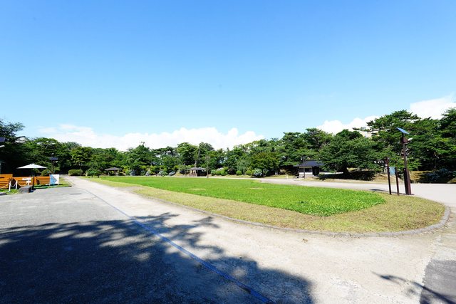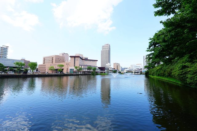 6. 千秋公園。旁邊有蓮花池,夜間會打各種不同顏色的燈光當作展示,公園二之丸剛好 有秋田犬拍照活動,每天有不同的秋田犬會跟民眾見面互動,不過天氣太熱秋田犬的活力 不足,但依舊不減其可愛程度