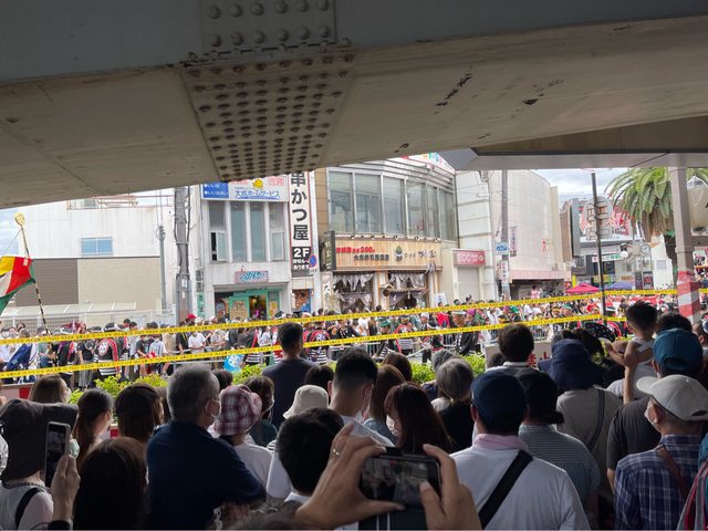 車站旁有零星祭典攤販,隨著人流走著走著就到了被封鎖的大路,攤位綿延,這裡等一下