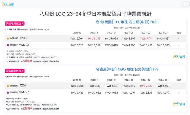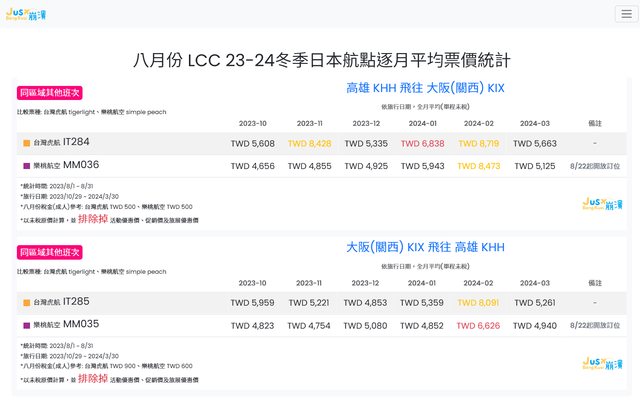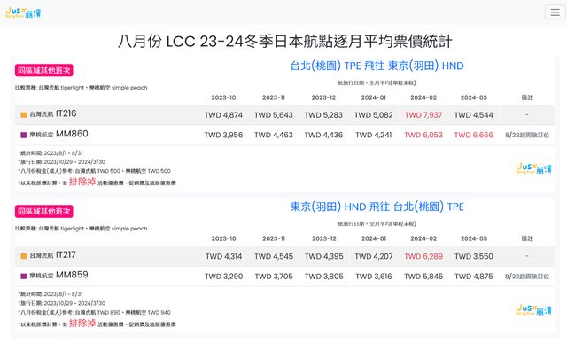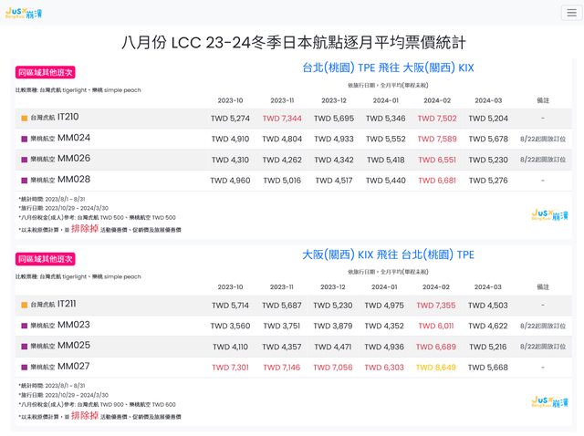 標題[分享] 8月份 LCC 23冬逐月平均票價統計