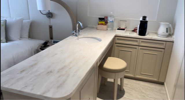 房間有個小吧台餅乾、瓶裝水、咖啡機,冰箱的酒類、飲料全部免費。 (因為入住兩天,第二天吃早餐時也有再補一份吧台、冰箱的飲品、餅乾、咖啡)