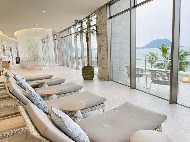 大廳挑高空間採光充足且景觀很好,唐津灣的海景在大廳就能一覽無遺。